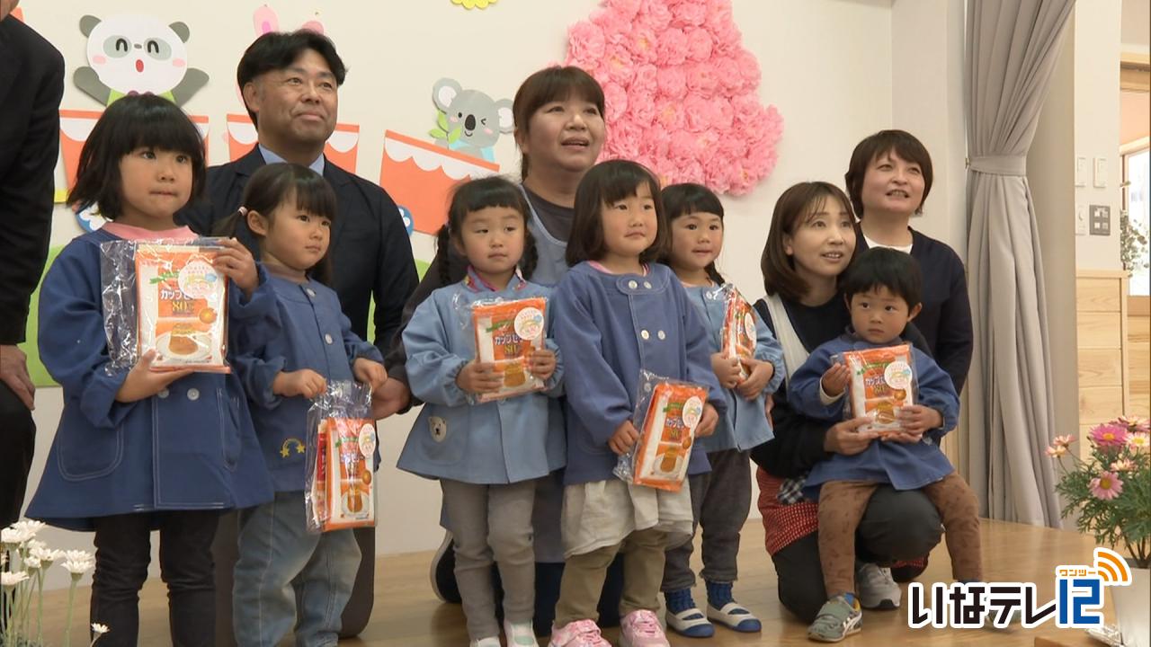 農林・水産村の園児にりんごをプレゼント
