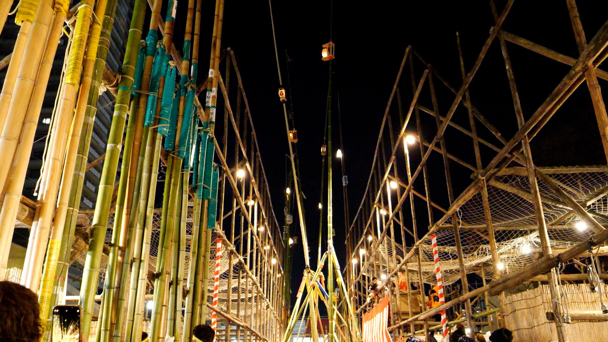 現在では、高さ約10メートルの矢来を設置し、各団体がぶつかり合いながら竹竿を激しく揉み合う祭りとなっています。