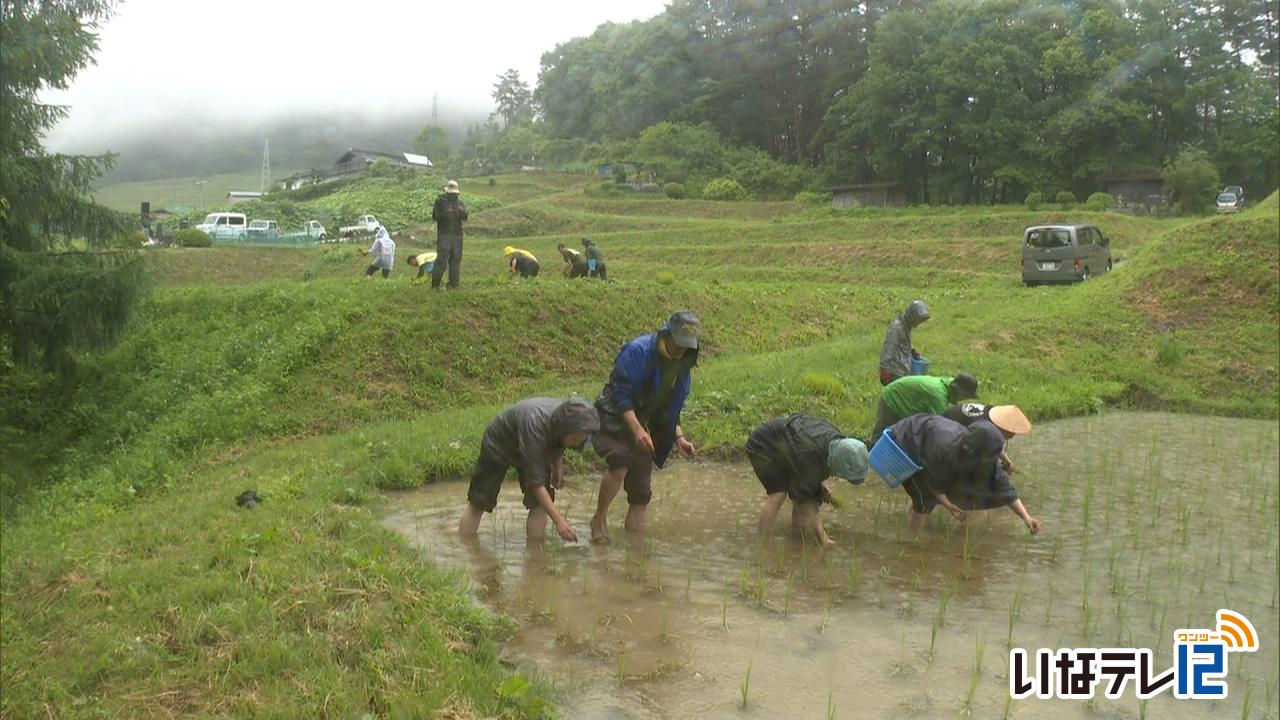 伊那市富県のまつり芸能集団田楽座と、伊那市長谷の株式会社Wakka Agriが10日に、田植えで交流しました。